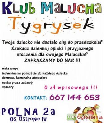 Klub Malucha Tygrysek to miejsce stworzone dla dzieci, które nie chodzą do przedszkoli, a ich rodzice pracują lub też potrzebują chwili dla siebie. Wasze dziecko będzie u nas otoczone czułą i troskliwą opieką wykwalifikowanego personelu. Swobodna zabawa połączona z zajęciami edukacyjnymi, wybrane rodzaje aktywności ruchowej dostosowane do możliwości i potrzeb Dziecka zapewnią mu bezpieczne zaspokajanie naturalnej ciekawości poznawania otaczającego je świata.