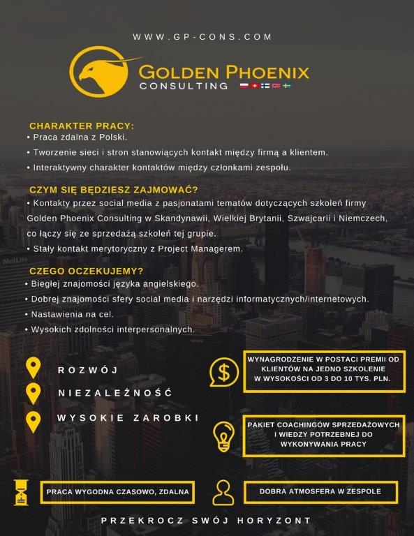 Kontakty przez social media z pasjonatami tematów dotyczących szkoleń firmy Golden Phoenix Consulting w Skandynawii, Wielkiej Brytanii, Szwajcarii, Niemczech, co łączy się ze sprzedażą szkoleń tej grupie