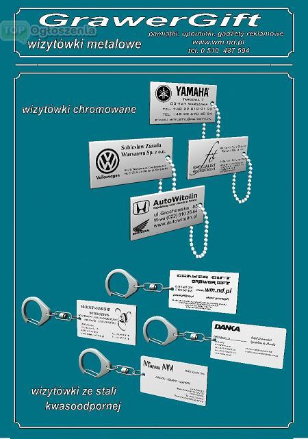 Wizytówka metalowa w formie breloczka, wykonana ze stali kwasoodpornej, z danymi teleadresowymi ale i z logiem grawerowanym laserowo ( nawet bardzo skomplikowane kształty )