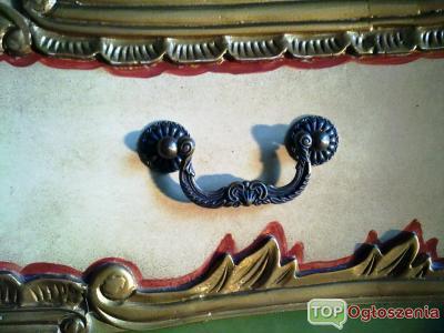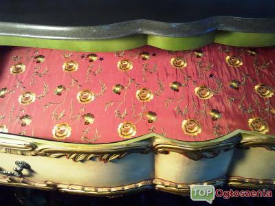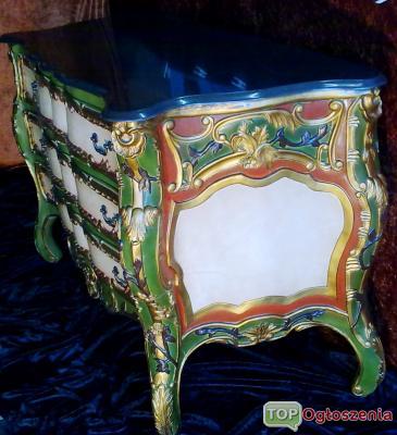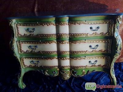 Oferuje na sprzedaz piekna komode barokowa. Pochodzi ona z poczatku roku 1800 w typowych dla Rokoko pastelowych kolorach zdobiona floralnymi motywami powszechnymi w jej epoce. Szuflady wyscielane jedwabnym materialem z kwiecistym haftem (nie mam jednak pewnosci , czy material nie zostal odnowiony w pozniejszym czasie)