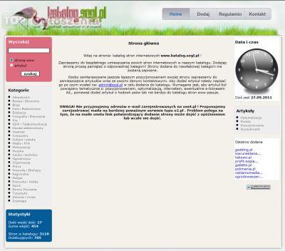 Czy Państwo też uważacie, że osiągnięcie sukcesu prowadząc serwis internetowy jest rzeczą trudną? Wielu prawdopodobnie, zgubnie tak myśli. O fakcie czy serwis osiągnie sukces, czy umrze śmiercią naturalną decyduje przede wszystkim użyte oprogramowanie i chęć do pracy właściciela. Nie sugerujcie się porażkami właścicieli serwisów stworzonych za 20zł - spróbujcie sami z zachowaniem pełnego profesjonalizmu w swoim działaniu. Wykonam dla Państwa profesjonalny katalog stron internetowych w cenie 400 PLN netto. Rozpocznijcie swoją przygodę z biznesem internetowym już dziś! Internet do tej pory nie jest w pełni nasycony i opłaca się każdemu kto podejdzie poważnie do sprawy. Katalog, który oferuję oprócz samego modułu zapisującego adresy e-mail użytkowników (aby później wysłać im płatne mailingi), umożliwia też emisję reklam Google Adsense, dzięki którym można uzyskać wymierne zyski za kliknięcia w reklamy.